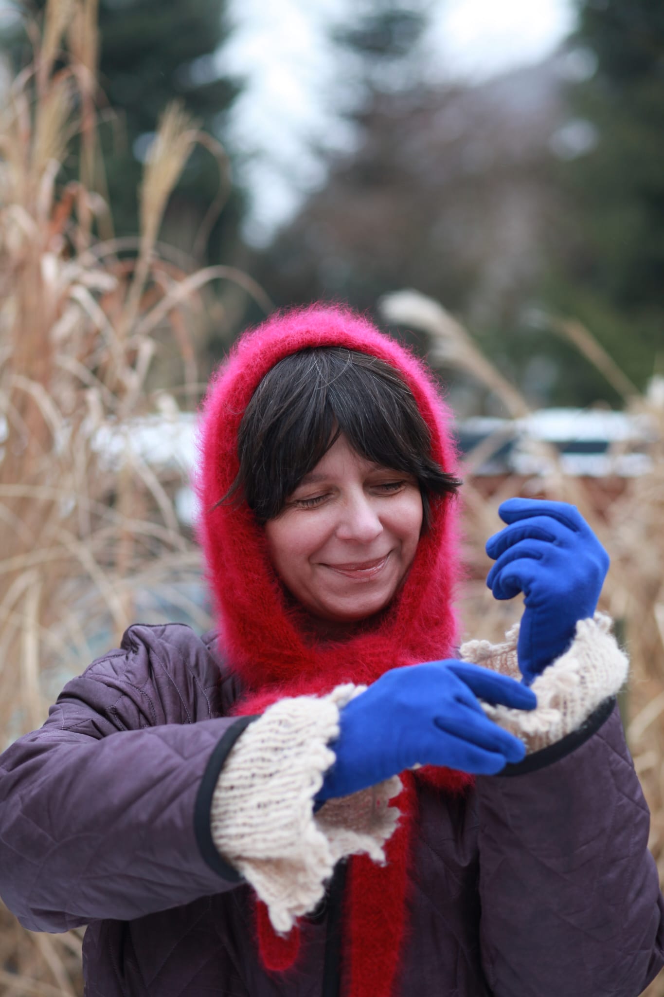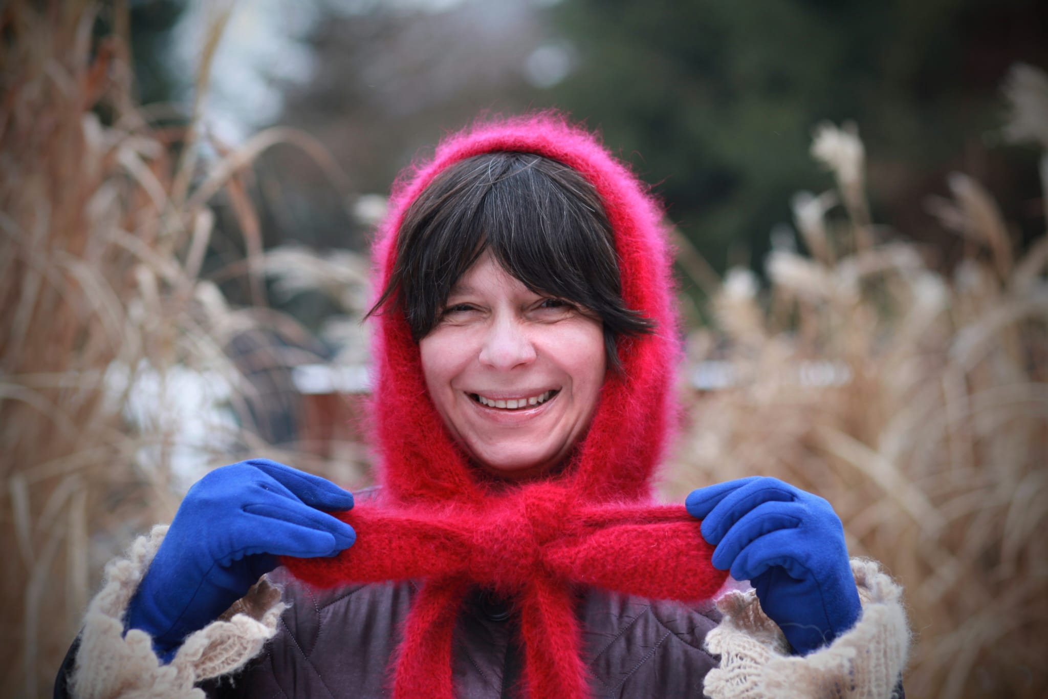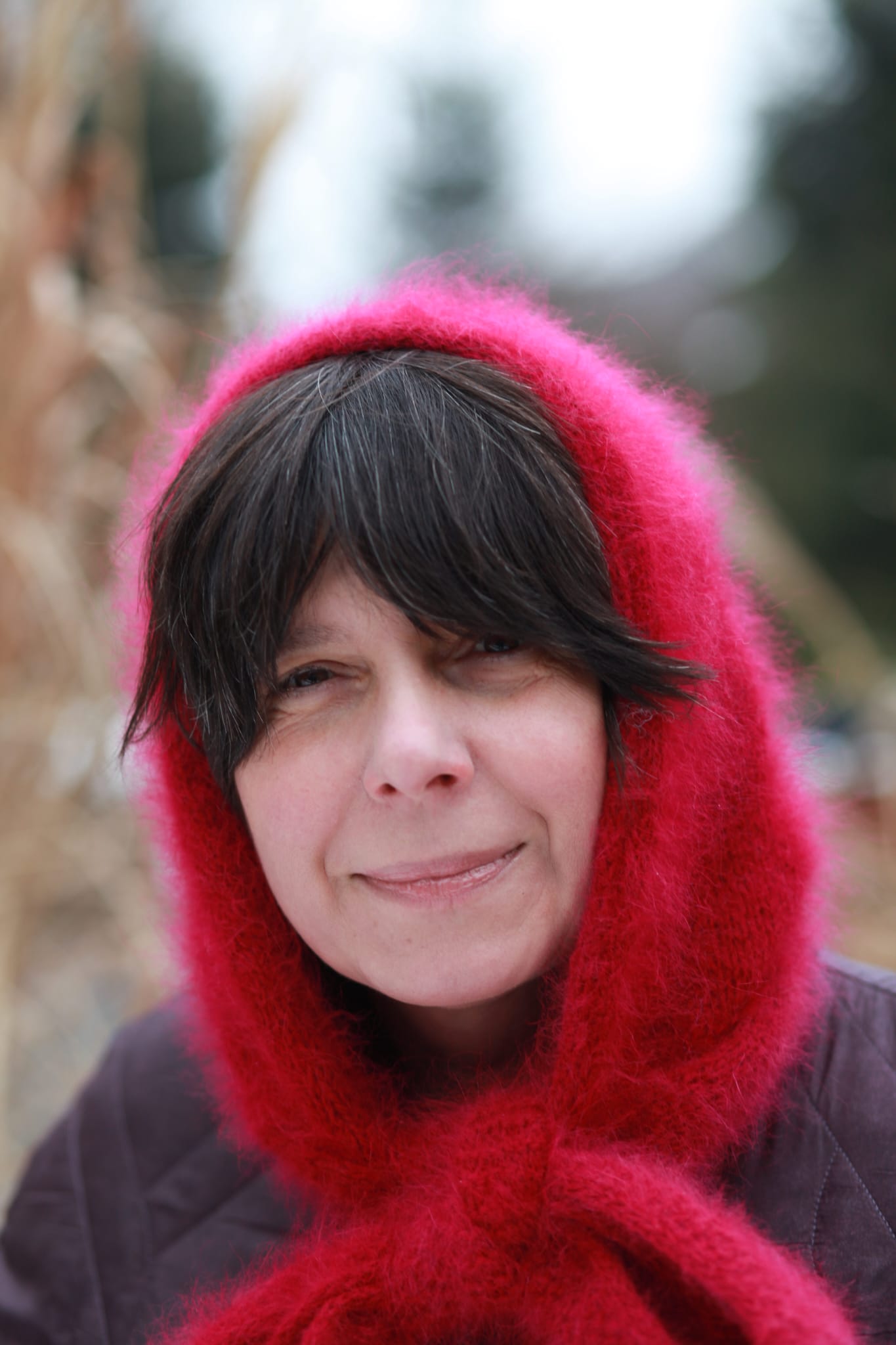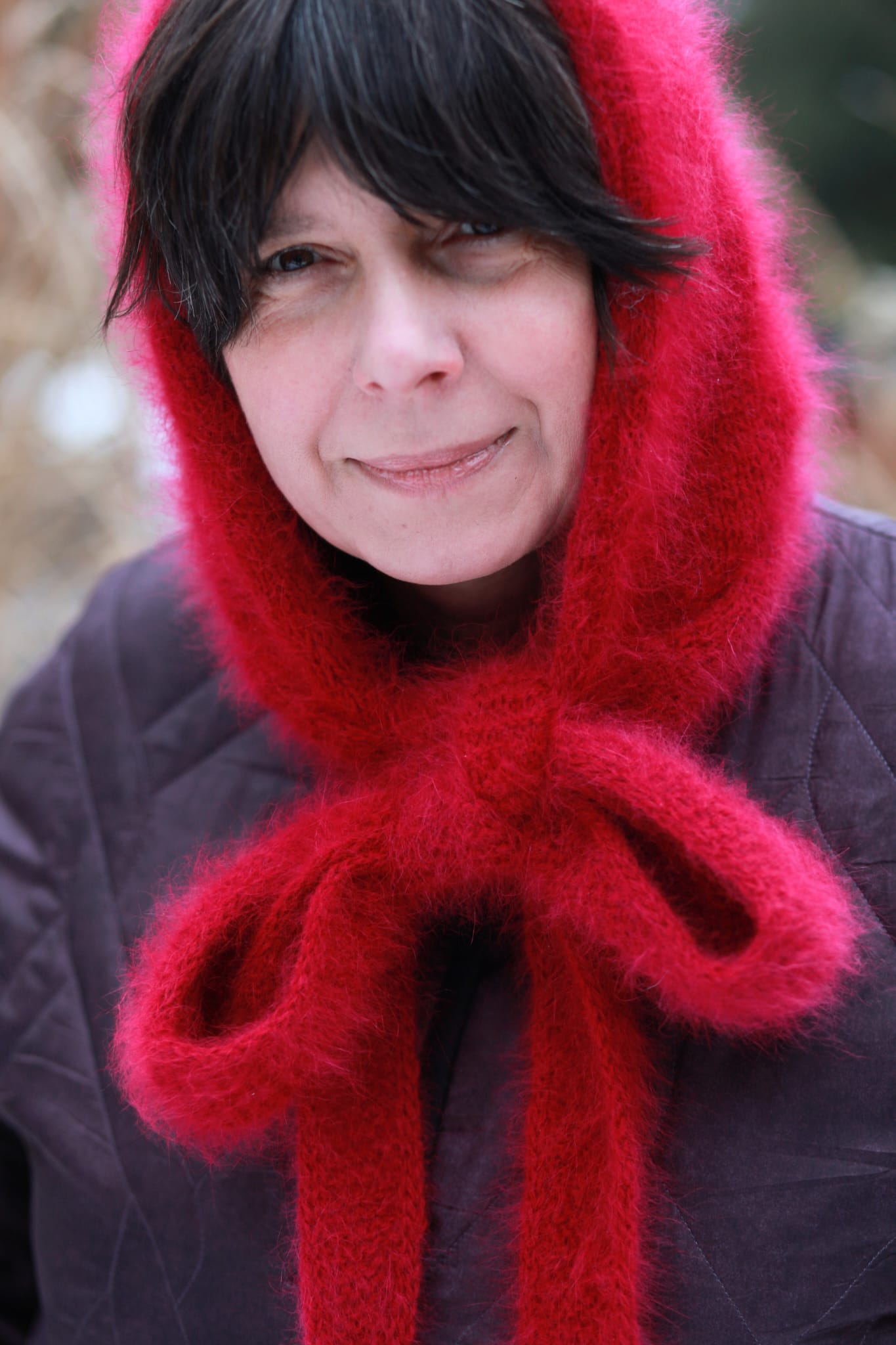 Die Farbe – ein tiefes Kirschrot – ist kein bloßes Detail. Sie ist ein emotionaler Akzent. Sie belebt das winterliche Licht und unterstreicht die Natürlichkeit des Gesichts.