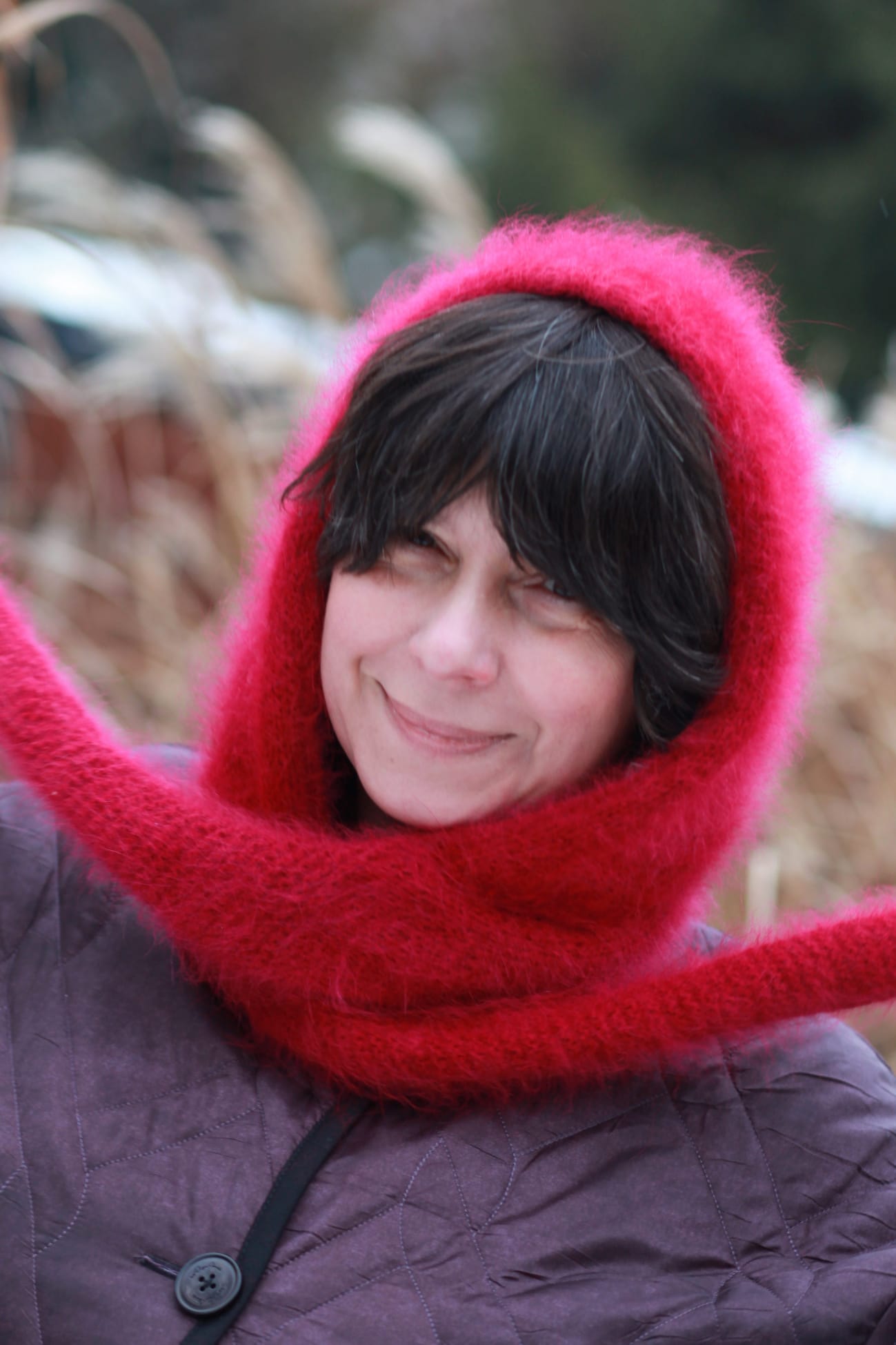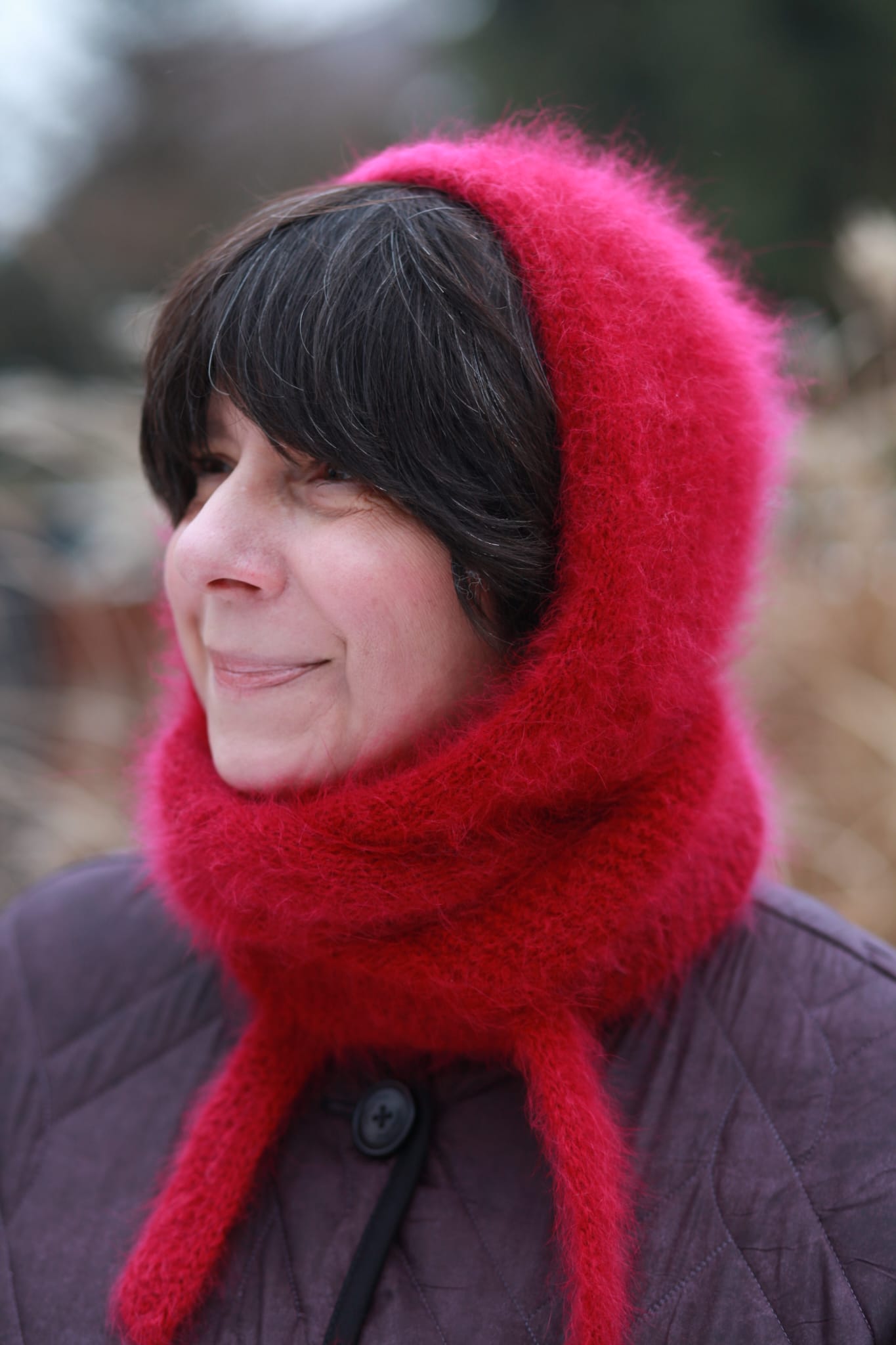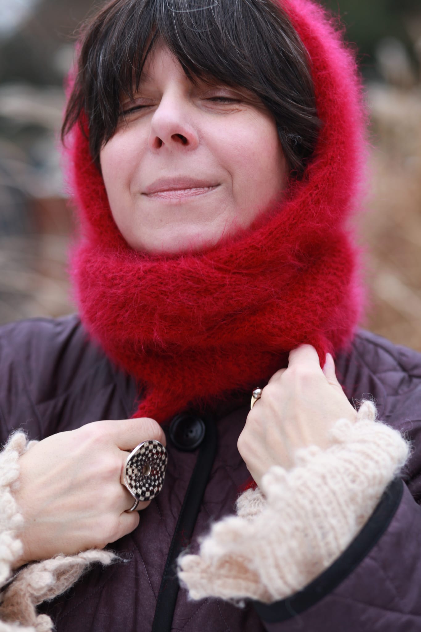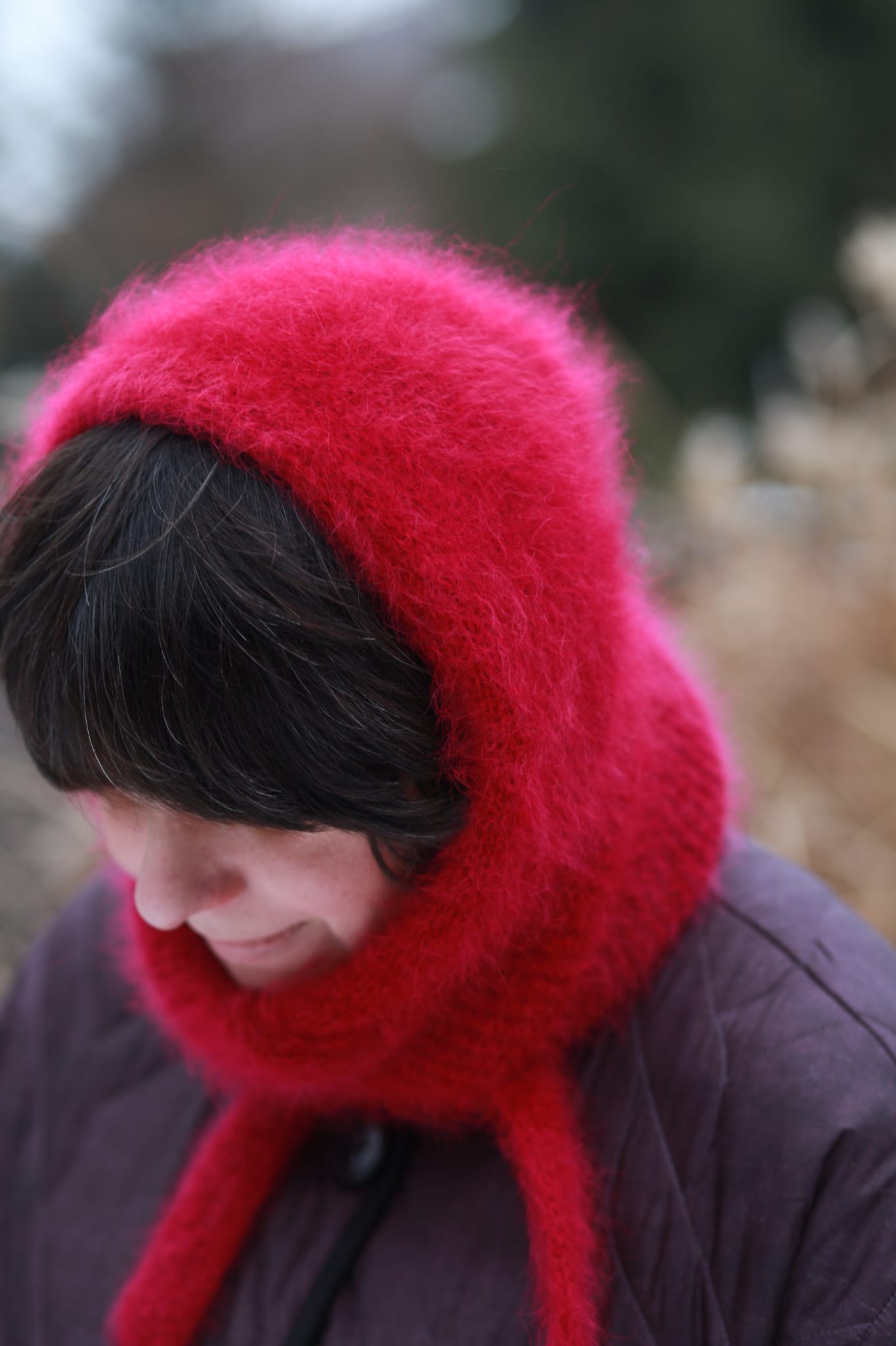 Ręcznie dziergany kaptur z angory i merino, wykonany w całości na drutach, bez szycia. Wykończony techniką i-cord, która nadaje krawędziom miękkość i perfekcyjną linię. Lekki, puszysty i wyjątkowo komfortowy, w głębokim wiśniowym kolorze